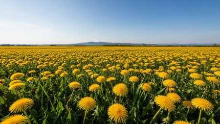 A lush field is filled with bright yellow dandelions swaying gently in the breeze under a clear blue sky. This vibrant display showcases the beauty of nature in springtime.