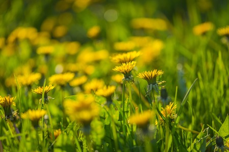 Yellow dandelion flowers on a green meadow in the sunny daylight.