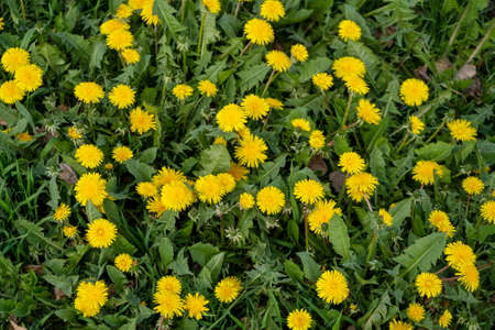 Many flowering yellow dandelions (lat. Taraxacum) among the green foliage in spring.