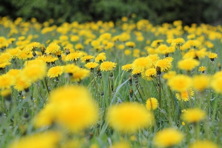A field of bright yellow dandelions in full bloom, surrounded by lush green grass. The vibrant flowers create a cheerful and natural springtime scene