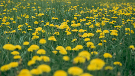 Closeup of yellow spring flowers on the ground. Green field with yellow dandelions.
