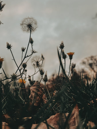 Dandelion in the Meadow. A close-up shot of a dandelion and other wildflowers in a field, with a blurred background of the cloudy sky. Wildflowers.