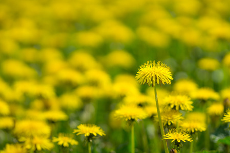 Green field, blooming yellow dandelion flowers on a clear sunny day. Idyllic summer rural scene. Nature, botany, environment, ecology, agriculture, alternative medicine. Symbol of peace and joy