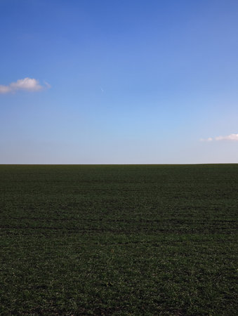 Vertical Green field extending to horizon under clear blue sky with few clouds in Prague, Czechia, offering serene and peaceful view