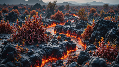Eerie volcanic landscape with glowing plants amidst flowing lava rivers