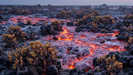 Lava field with newly formed volcanic rock creating a stark landscape at twilight