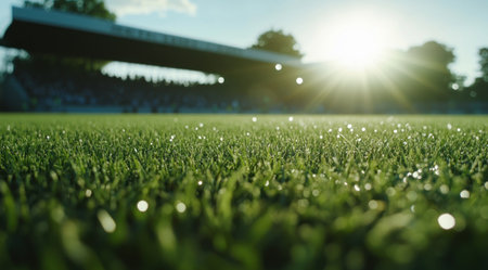 A close-up shot of the green grass on an outdoor football field, illuminated by sunlight. The camera is positioned at ground level to capture details and textures in high resolution. In front of it stands a soccer stadium with fans cheering, creating a lively atmosphere for commercial use. --ar 128:71 --v 6.1 Job ID: f13a3ec4-2f3b-4342-9623-969f677f5e72