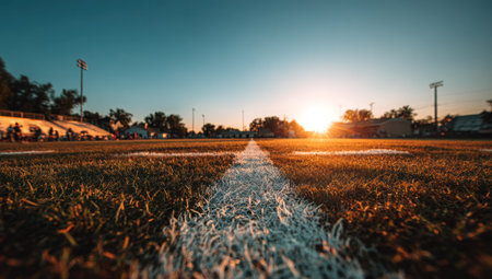 An outdoor view captures a football field at sunset. Green grass and a white line dominate the foreground. The warm light from the sun illuminates the field, with blue sky above. This image can be used in projects about sports, recreation, or to create a natural, engaging background.