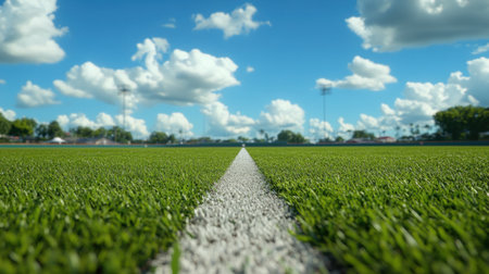 Captivating view of a vibrant green sports field under a blue sky dotted with clouds, highlighting clear line markings ideal for athletic events.