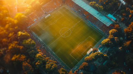 A stunning aerial view capturing a lively football stadium surrounded by lush greenery during sunset. The image beautifully depicts the exciting atmosphere of a crowded sports event.