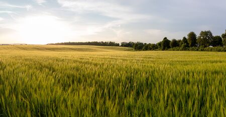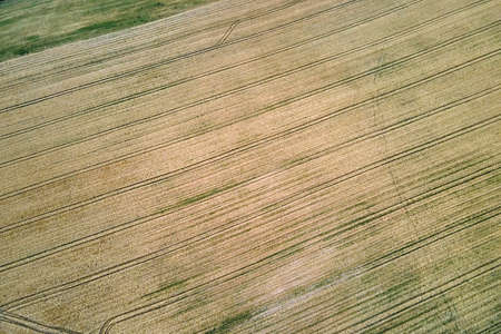 Aerial landscape view of yellow cultivated agricultural field with ripe wheat on bright summer day