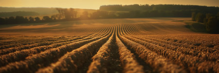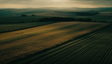Rolling wheat fields in autumn at dawn generated by artificial intelligence