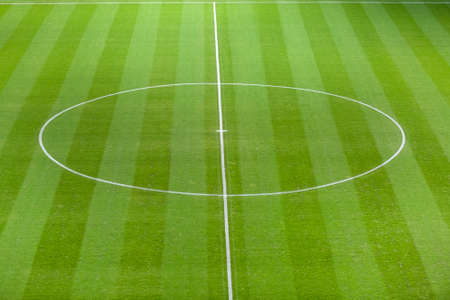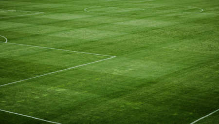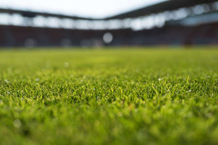Green grass on outdoor stadium, selective focus. sport and games. healthy lifestyle. playing football field.