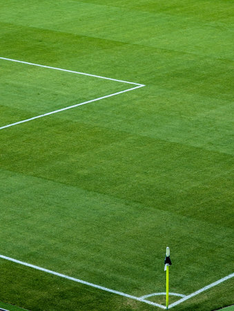 A close view of a football pitch corner, featuring a yellow corner flag, white boundary lines, and well-manicured green grass. Ideal for sports, stadium, teamwork, and outdoor activity visuals