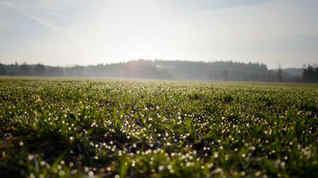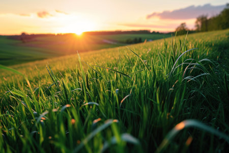 Close-up of green grass covered in dew drops, glistening in the morning sunlight. Rolling green hills and a distant treeline are visible under a...