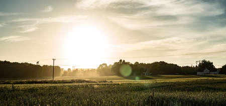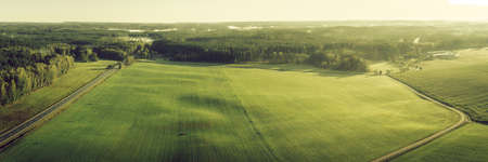 Warm aerial panorama view of picturesque autumn morning sunrise. Diagonal green forest, black road, agricultural field mist and power lines.