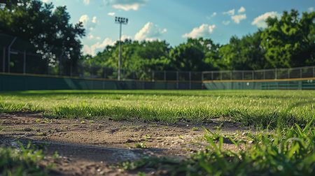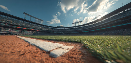 An open baseball stadium is captured from a low angle, emphasizing the field's texture and architecture. The image showcases a bright sky with soft clouds, creating a vibrant outdoor setting. The composition could be useful for commercial and editorial purposes related to sports and events.