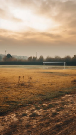 Serene Empty Soccer Field Surrounded by Tall Trees on a Cloudy Day. Concept of Tranquility in Nature, Outdoor Sports, and Peaceful Landscapes.