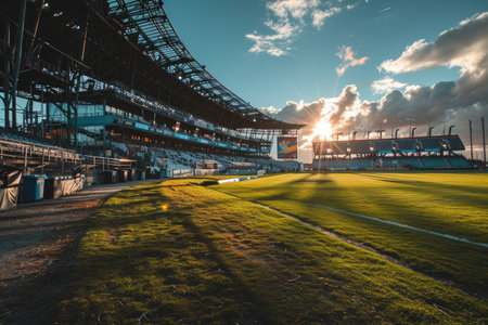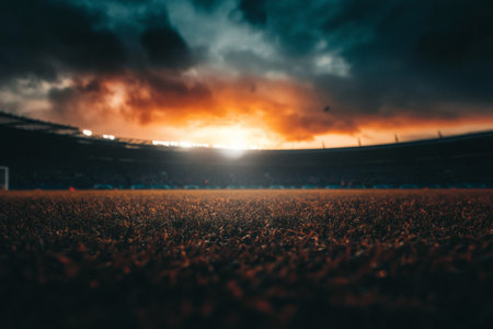 A stunning sunset lights up the sky above a football stadium as the day turns to night. Dark clouds hover, creating a moody atmosphere. The field is visible in the foreground, painted with vibrant hues of orange and blue.