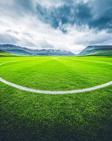 A lush, emerald football pitch contrasts sharply with rugged mountain peaks, under a moody sky that hints at an approaching storm.