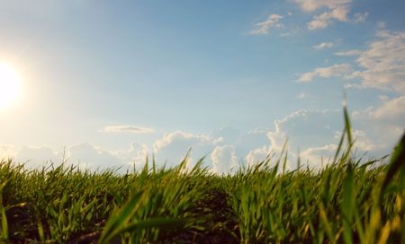 A close-up shot features lush green grass dominating the frame, with individual blades textured and detailed. Above, a deep blue sky provides a contrasting backdrop. The scene evokes a sense of natural beauty. Suitable for a range of commercial applications, including editorial and marketing material.