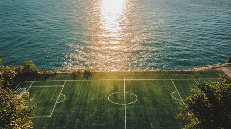 This aerial image showcases a well-maintained soccer field surrounded by water and greenery, highlighting the blend of urban life and outdoor recreation.