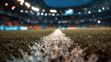 A dramatic close-up of a white marking line on lush green grass of a soccer field, beautifully illuminated by stadium lights during an evening match.