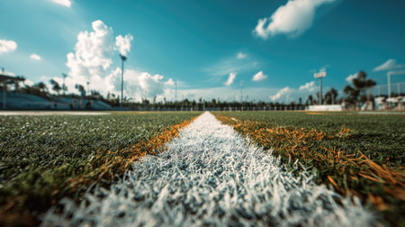 A striking close-up of a white line on a green sports field, capturing the vibrant colors against a backdrop of bright blue sky with fluffy clouds.