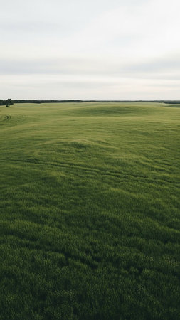 Lush showing an aerial perspective of rolling green fields with gentle undulations, showing the texture of lush vegetation under a soft, overcast sky with subtle...