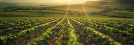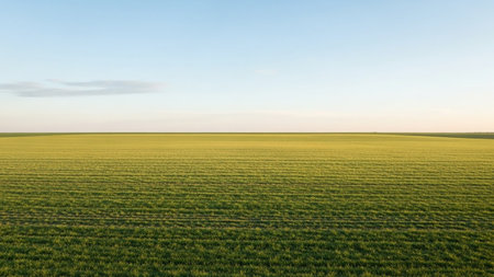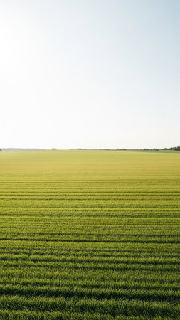An expansive green field of young crops planted in perfectly straight rows stretches to the horizon under a clear, bright sky, creating a minimalist landscape.