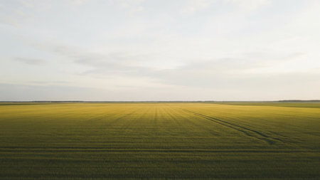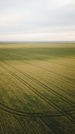 A vast expanse of golden green wheat field stretches to the horizon under a pale, cloudy sky. Tractor tire tracks create diagonal patterns across the undulating...