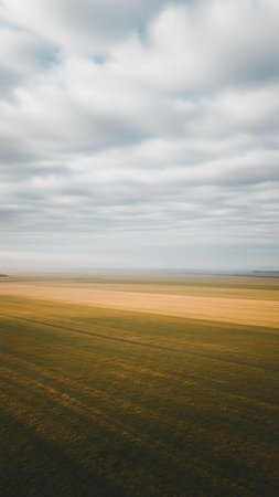 A wide aerial view of agricultural fields showing distinct green and golden brown striped patterns under a cloudy, expansive sky.