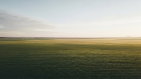 A vast green field with linear textures extends to a distant, hazy horizon under a soft, pale sky with subtle clouds.
