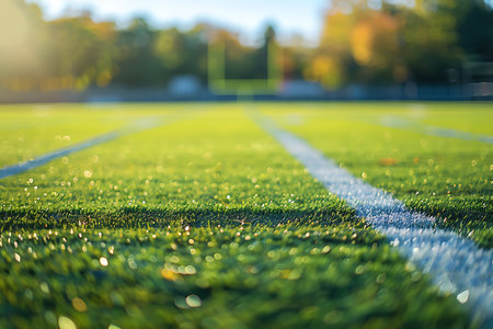 A detailed close-up of an artificial grass field glistening with dew under soft morning light, perfect for showcasing sports activities or outdoor recreational themes.