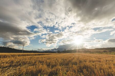 Sun rays shine through clouds over a freshly cut field on a farm. Northwest Oregon, USA.
