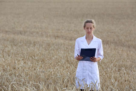 Woman agronomist or a scientist or a student with document in her hand in the wheat field. Agricultural business