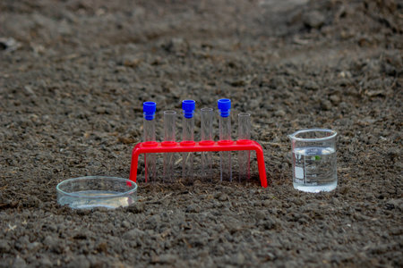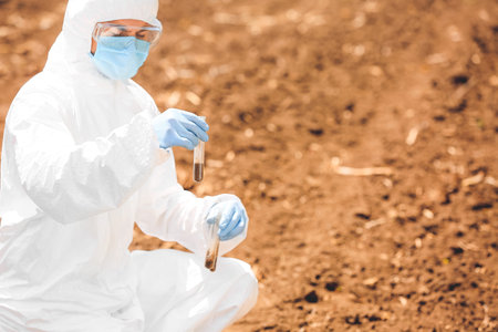 Close-up scientist examining sampling of toxic chemicals on polluted ground
