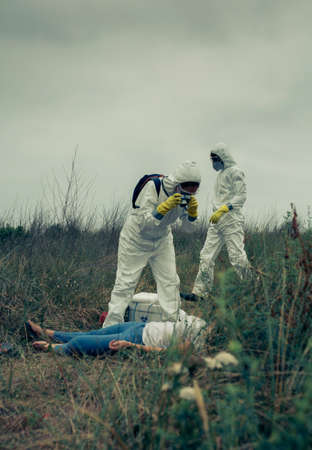 Woman in bacteriological protective suit taking a photo of a corpse, and her partner in the background examining the area