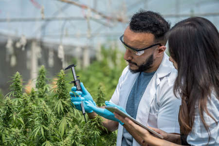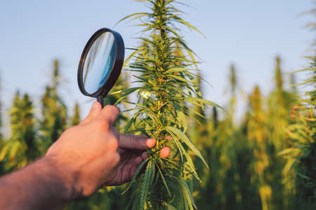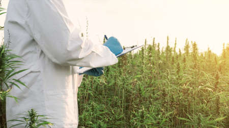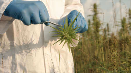 Doctor scientist checking hemp plants and trimming them with scissors. Medical cannabis sativa.