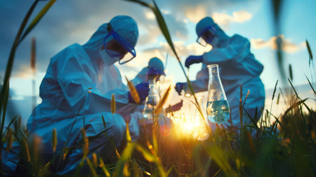 Factory scientists or biologists wear protective clothing while checking natural water sources near factories and farmland. Concept of Chemical protection may leak into natural water sources.