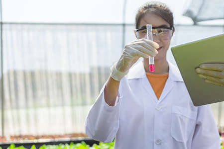 Scientists test the solution, Chemical inspection, Check freshness at organic, hydroponic farm.