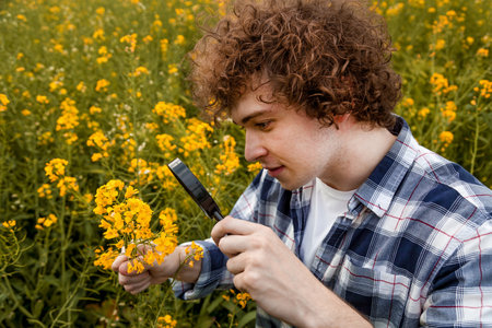 A researcher in protective gear studies flora in a grassy field, focusing on environmental analysis.