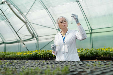 Confident female scientist looking at flask with soil sample while studying its characteristics
