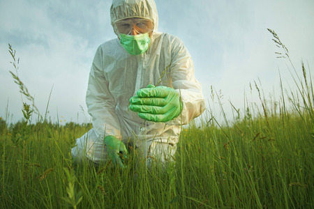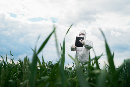 Man scientist in protective uniform examining green plants on summer field. Concept of safety and ecology. Focus on hand