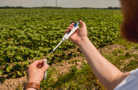 A farmer examines a plant in a wheat field. In his hand he holds a glass test tube with the test substance. Smart farming using modern technologies in agriculture and scientists concept