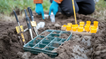 Soil erosion control experiment with slope gradient test trays and measurement tools