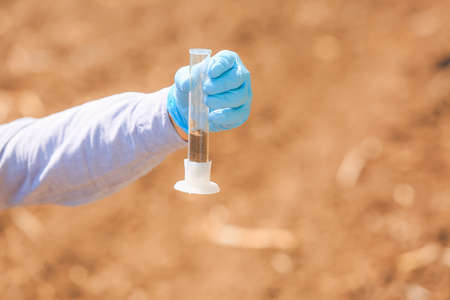Soil testing. Agronomy Specialist taking soil sample for fertility analysis. Hands in gloves close up. Environmental protection, organic soil certification, field work, research