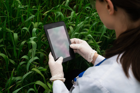 Young female ecologist scientist in goggles standing in green field and working on glass transparent screen.
