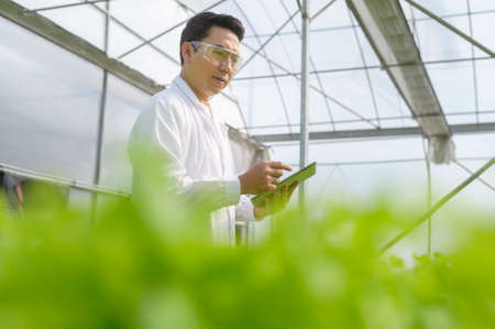 Scientist working in hydroponic greenhouse farm, clean food and food science concept