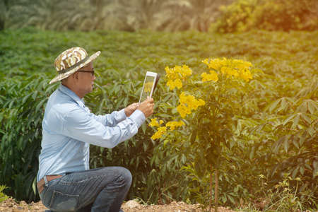 The Asian elder farmers man using the tablet with the display Yellow flower photography for further analysis in the laboratory.